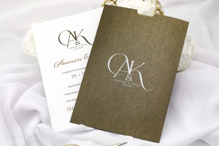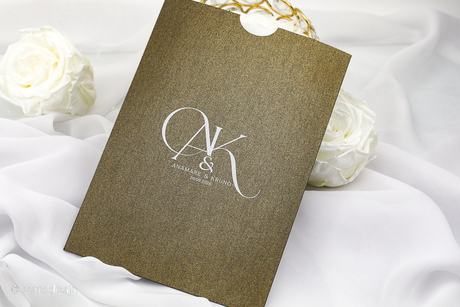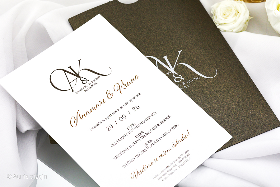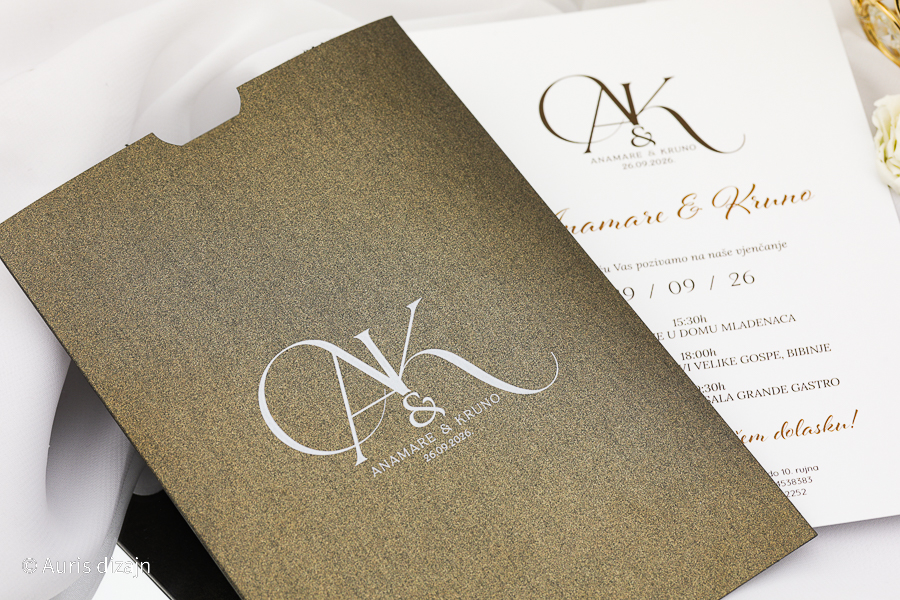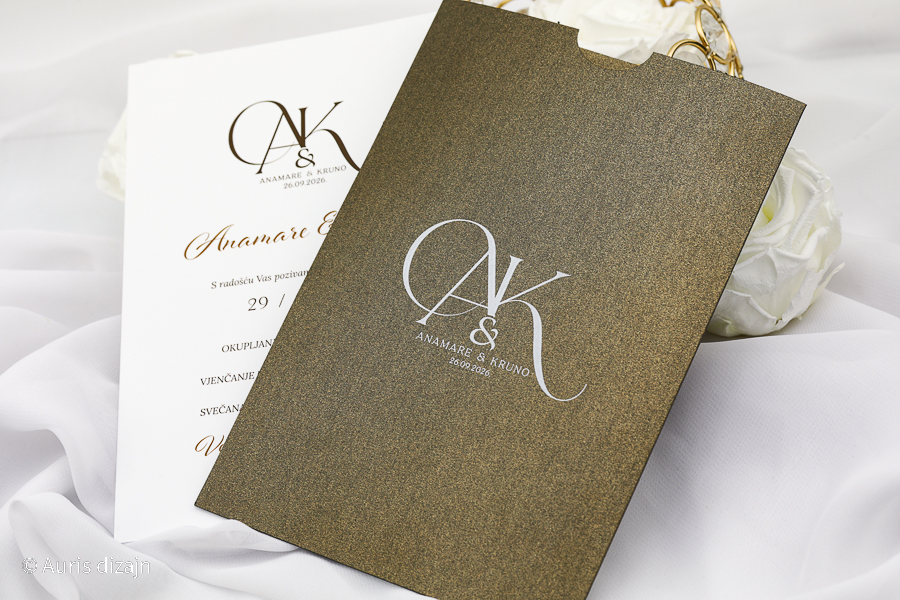 Luksuzna svadbena pozivnica izrađena od visokokvalitetnog, smeđeg etuia s zlatnim pearl efektom. Etui krasi precizno otisnut monogram mladenaca u bijeloj boji, dok unutarnja kartica (bijeli glatki karton) donosi profinjenu tipografiju i jasno strukturirane informacije o vjenčanju. Pažljivo odabrani materijali i vrhunska završna obrada daju pozivnici sofisticiran, premium izgled.