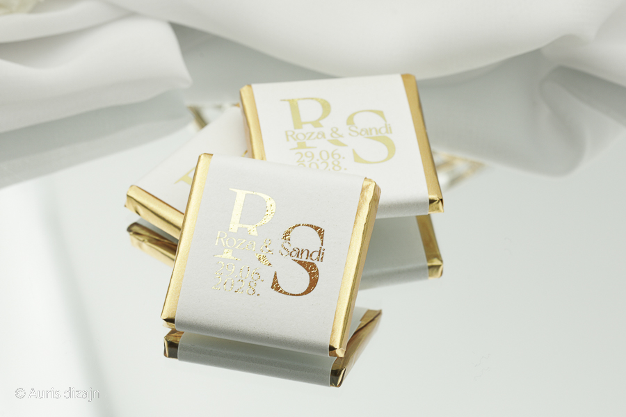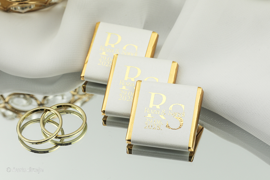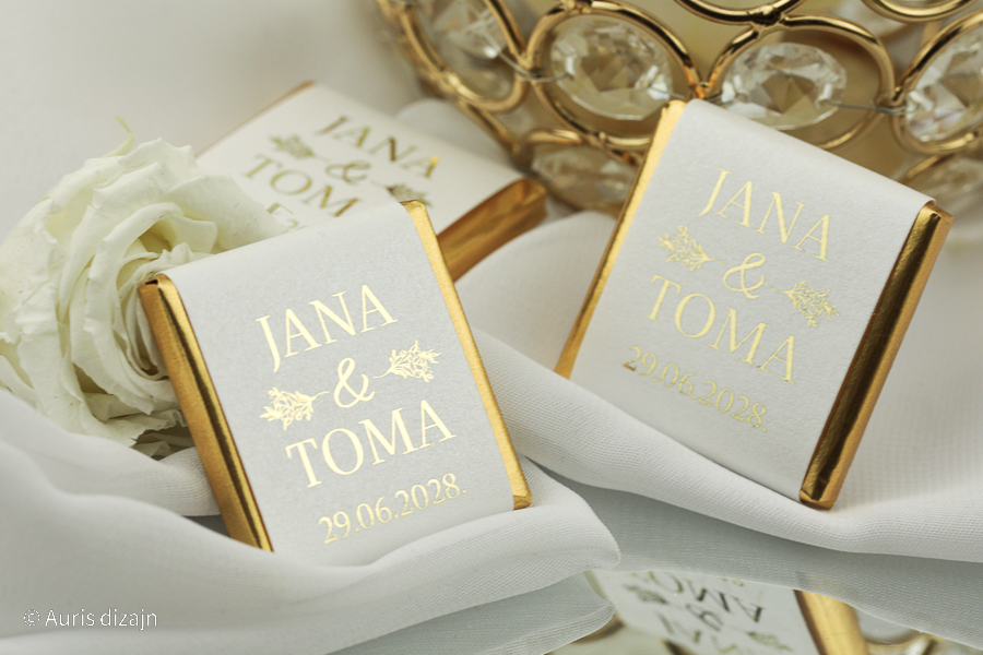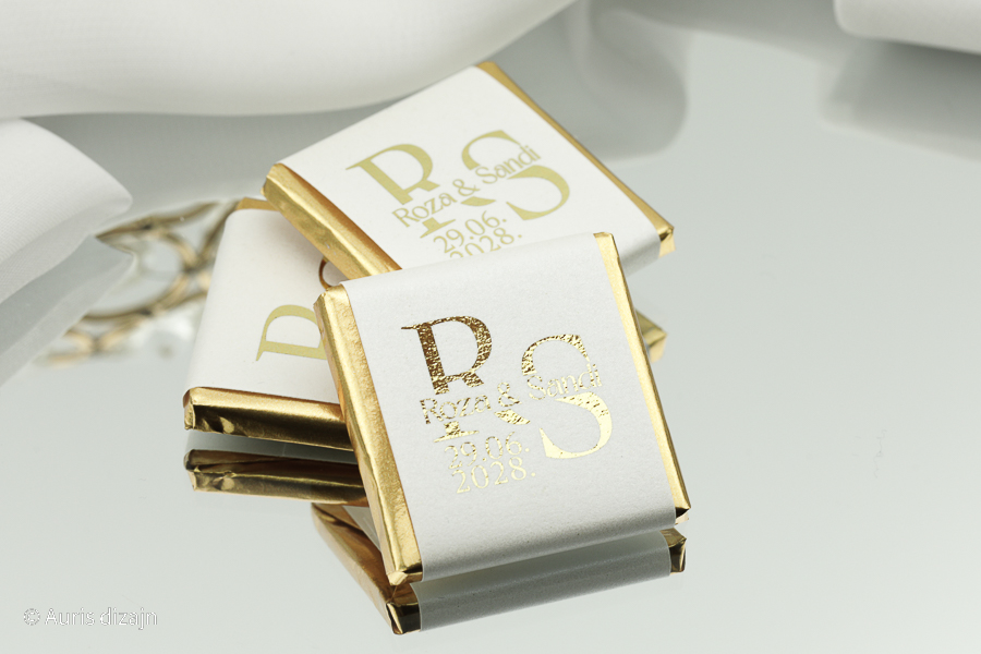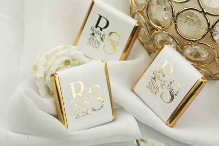 Elegantne mini čokoladice sa zlatnim detaljima, personalizirane po vašoj želji profinjen su znak pažnje za vaše goste.