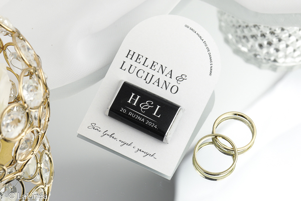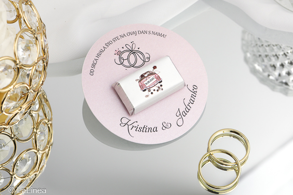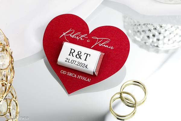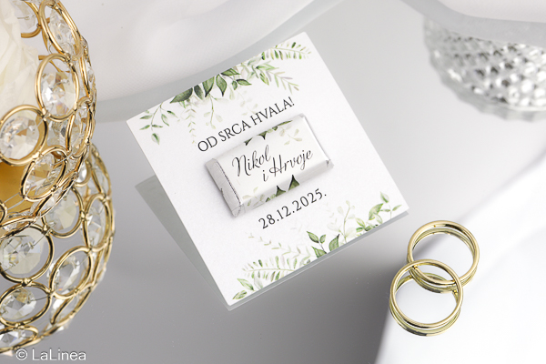 Čokoladica (5g) s personaliziranim omotom nalazi se na ukrasnom kartončiću.