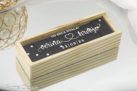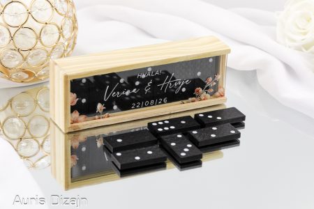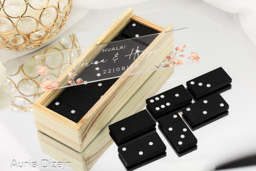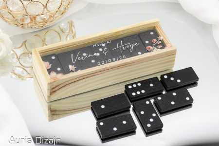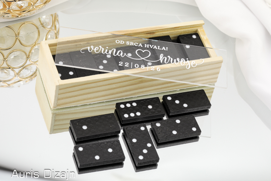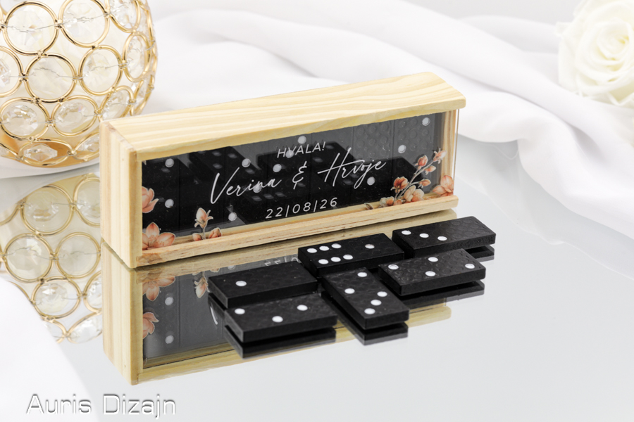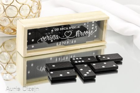 Igra domino sa 28 pločica unutar drvene kutije odličan je izbor kao poklon za goste. To je igra koja budi osjećaj nostalgije, a i potiče logično razmišljanje. Ovu će igru rado zaigrati i oni najmlađi i oni najmudriji. Na poklopcu kutije otisnut je vaš logo ili poruka po želji.