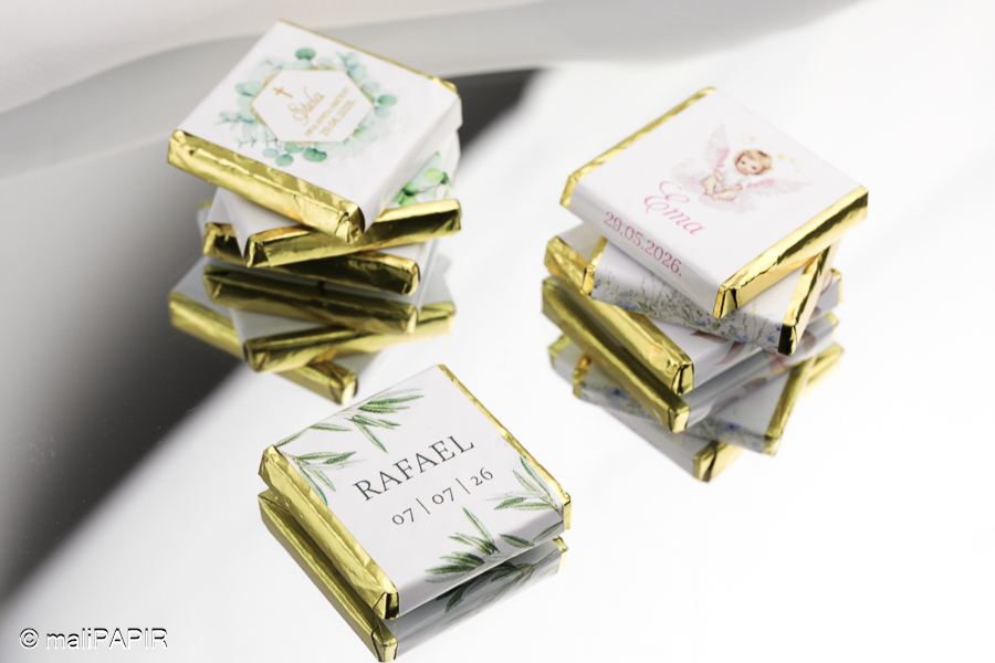 Mini mliječne čokoladice (5g) kvadratnog oblika u zlatnoj foliji omotane su personaliziranom naljepnicom po vašoj želji.