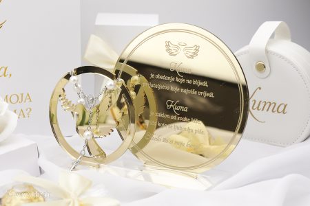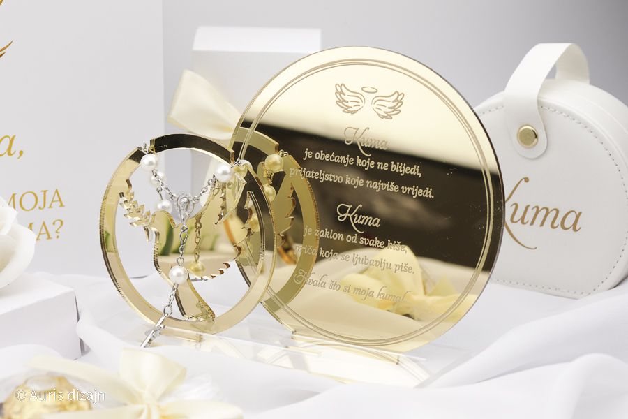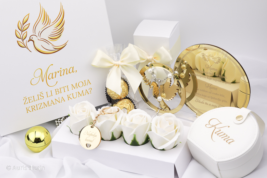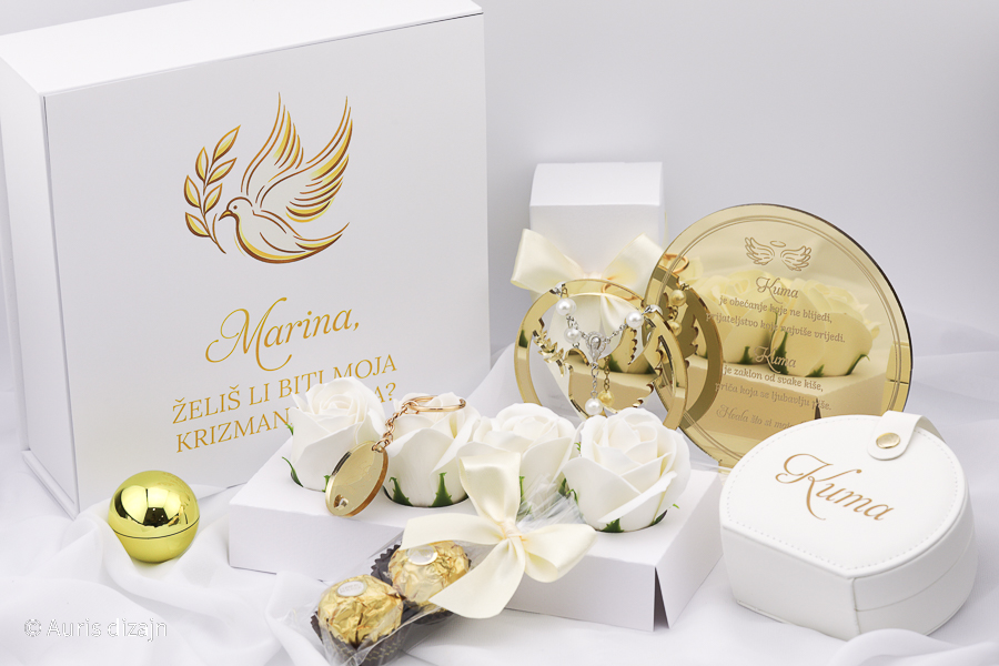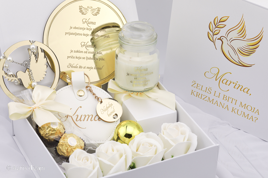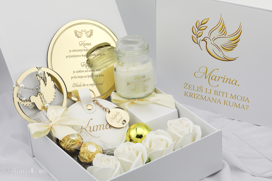 Ekskluzivnu kutiju bijele boje s elegantnim magnetnim otvaranjem napunili smo prekrasnim sitnicama koje će razveseliti svaku kumu. Kutija je s prednje strane personalizirana tekstom po želji npr. tekst možete izmijeniti u zahvalu kumi ili bilo koji drugi stih po vašoj želji.