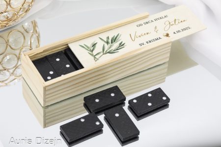 Igra domino sa 28 pločica unutar drvene kutije odličan je izbor kao poklon za goste. To je igra koja budi osjećaj nostalgije, a i potiče logično razmišljanje. Ovu će igru rado zaigrati i oni najmlađi i oni najmudriji.