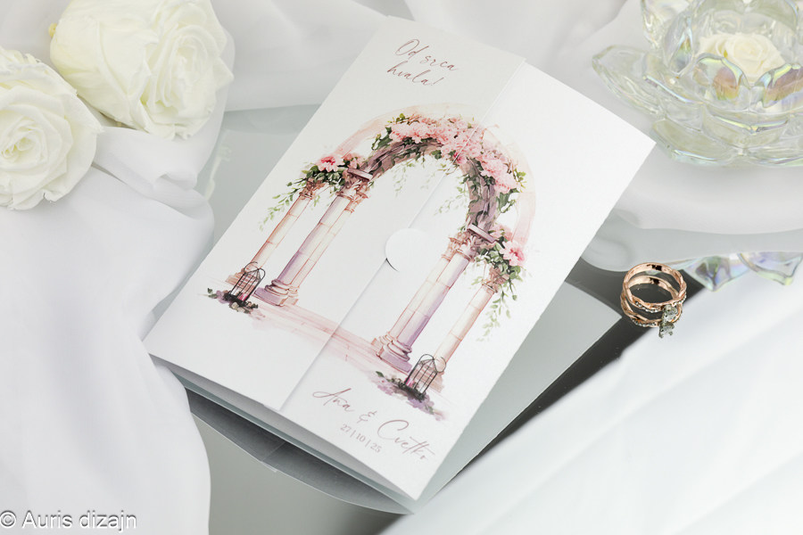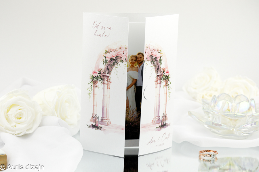 Zahvalnica s elegantnim dvostrukim otvaranjem i atraktivnim izrezom. Praktična i dekorativna – može samostalno stajati otvorena, poput okvira za fotografiju.