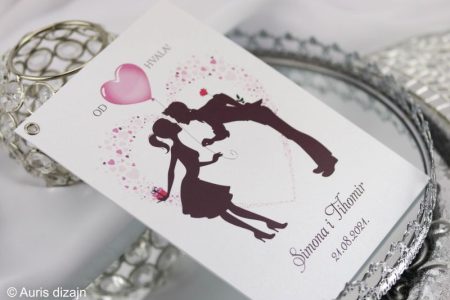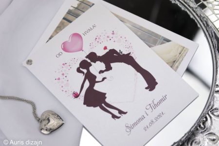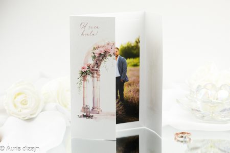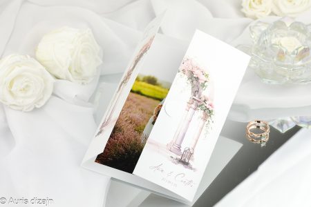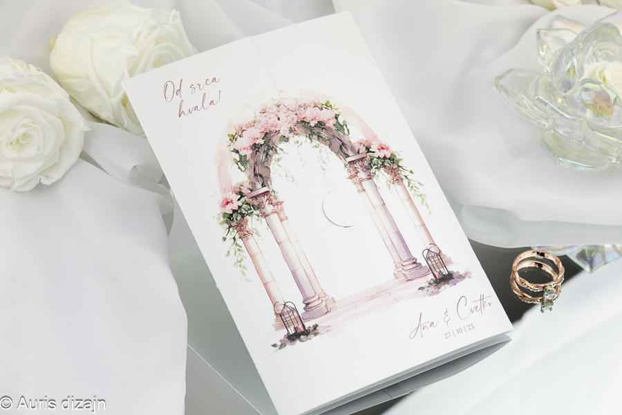 Zahvalnica s elegantnim dvostrukim otvaranjem i atraktivnim izrezom. Praktična i dekorativna – može samostalno stajati otvorena, poput okvira za fotografiju.